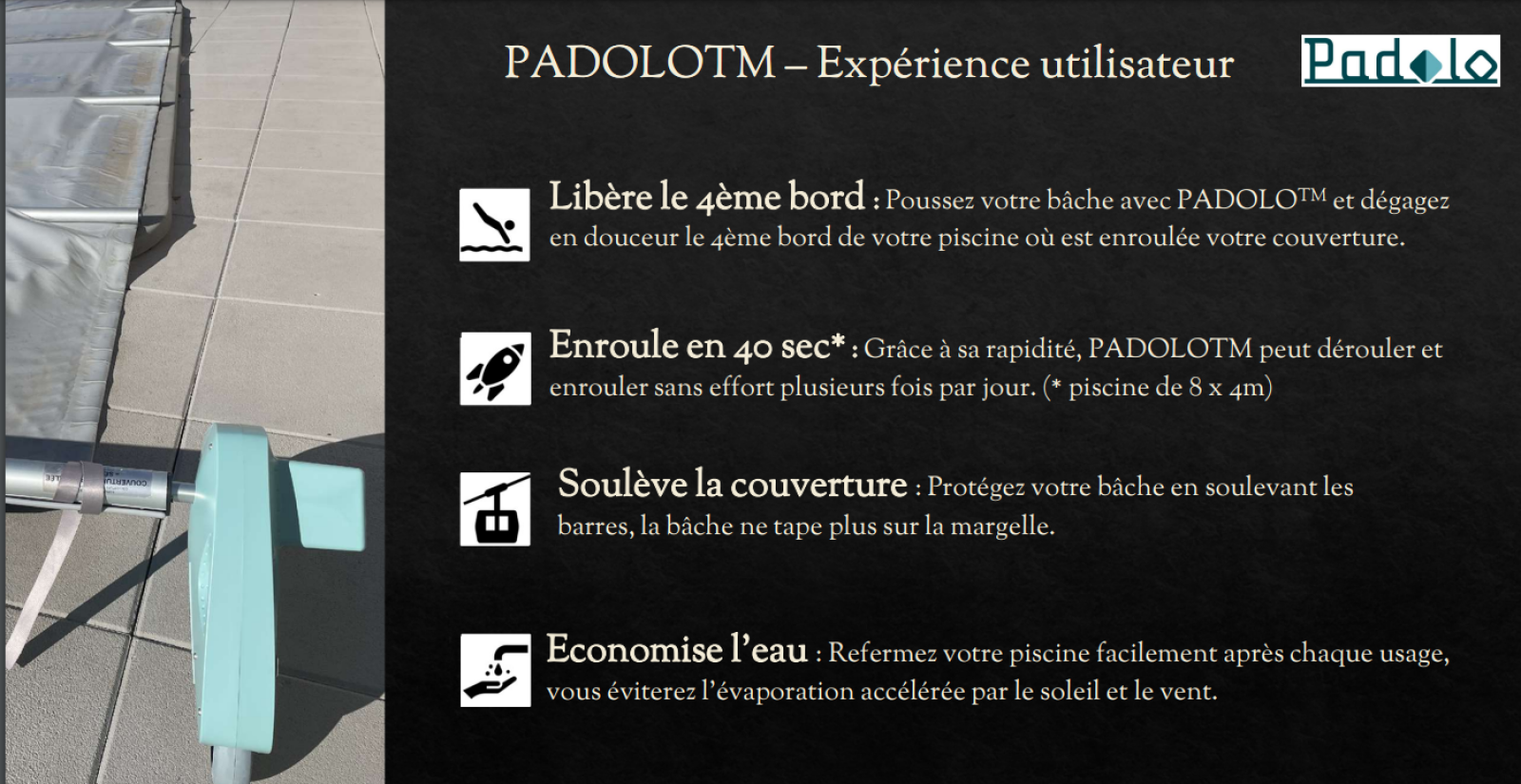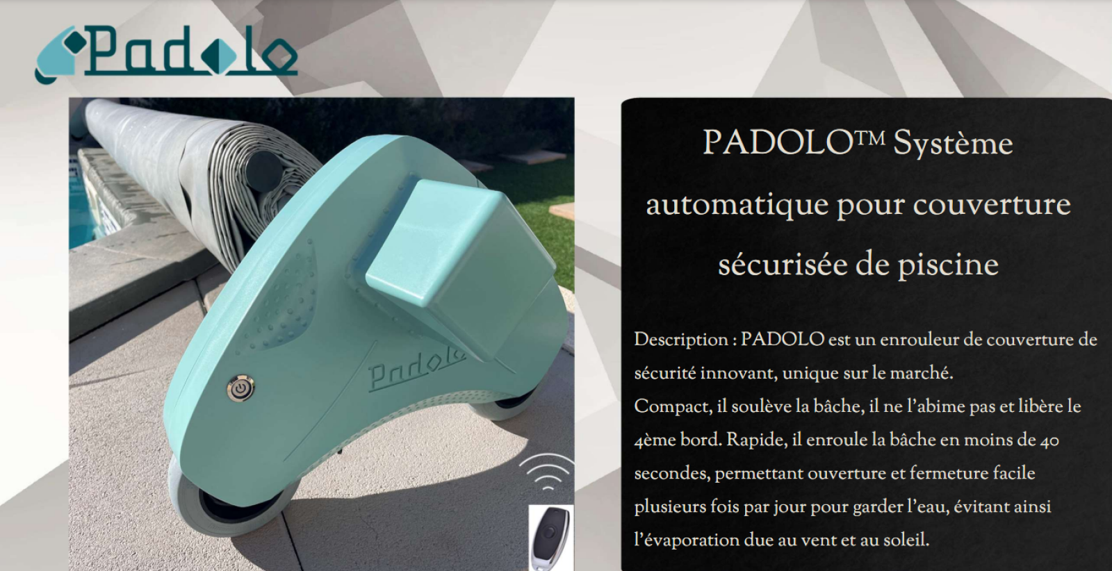 Le système PADOLO est un dispositif de motorisation conçu pour assurer la sécurité et la facilité d'utilisation des bâches à barres pour les piscines. Les bâches à barres sont des couvertures de piscine renforcées par des barres transversales, offrant une protection contre les chutes accidentelles et une isolation thermique. Le système PADOLO améliore ces couvertures en automatisant leur ouverture et leur fermeture, simplifiant ainsi leur manipulation et augmentant la sécurité.